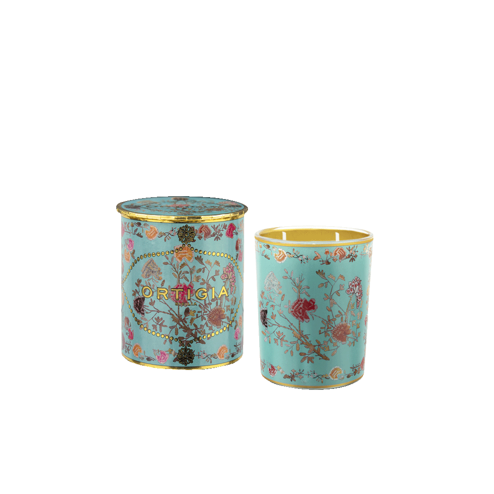 Un tarro de vela de cristal decorado con cera blanca, rico en la esencia natural de las flores primaverales sicilianas.