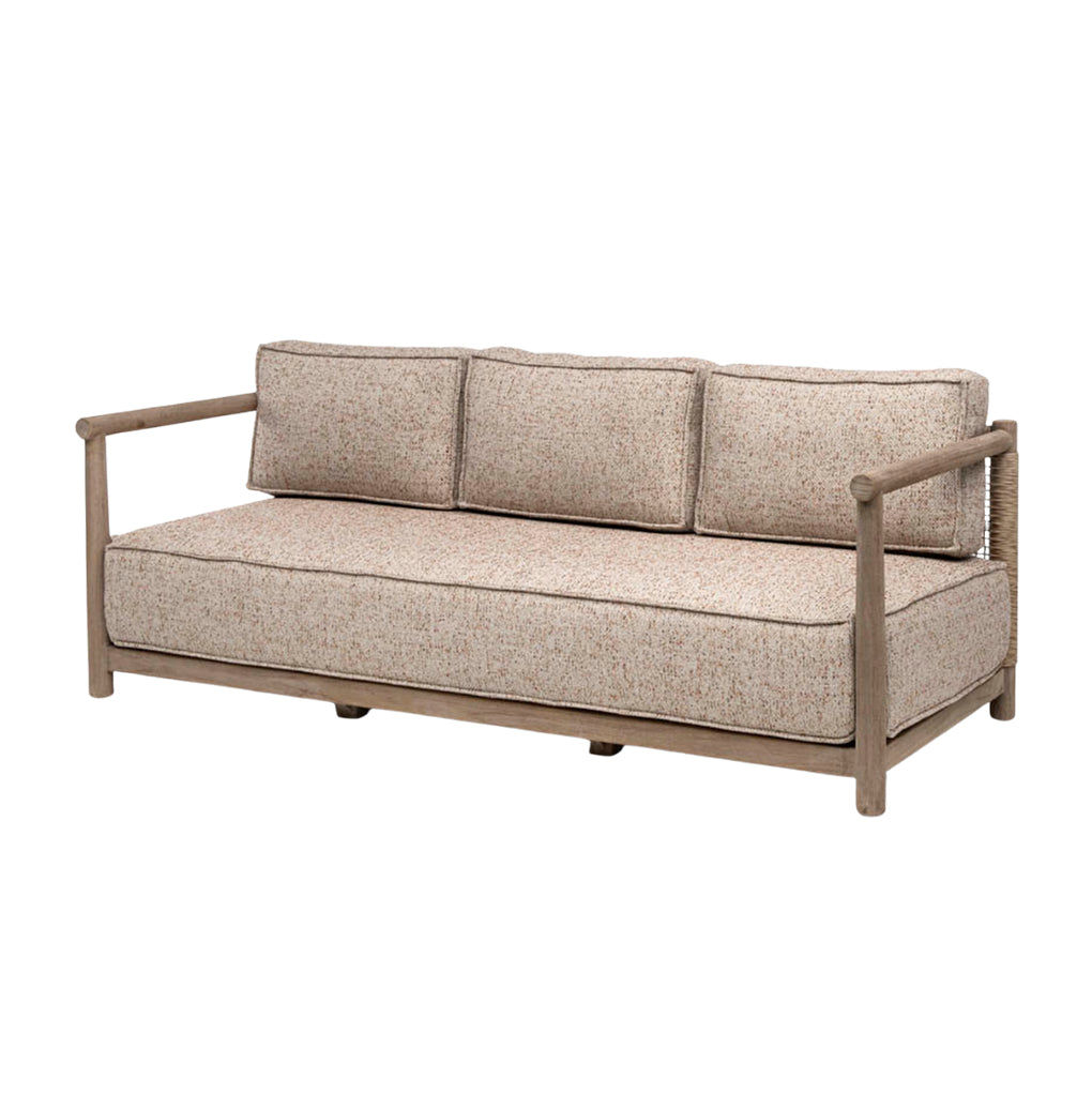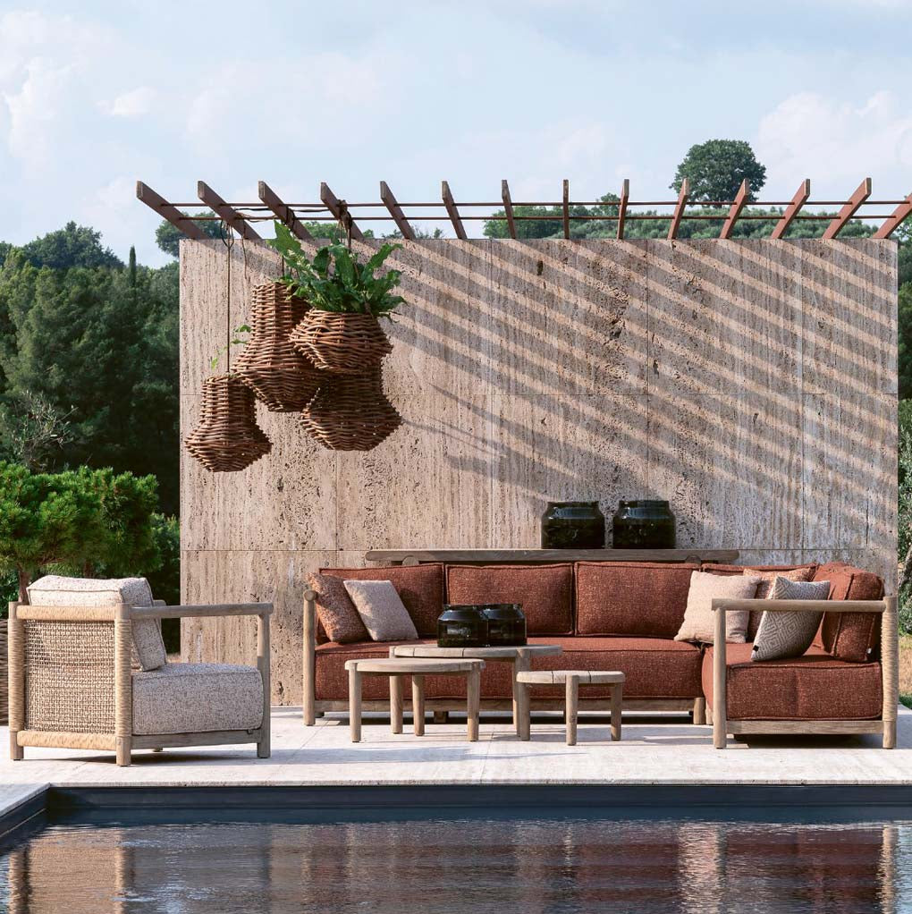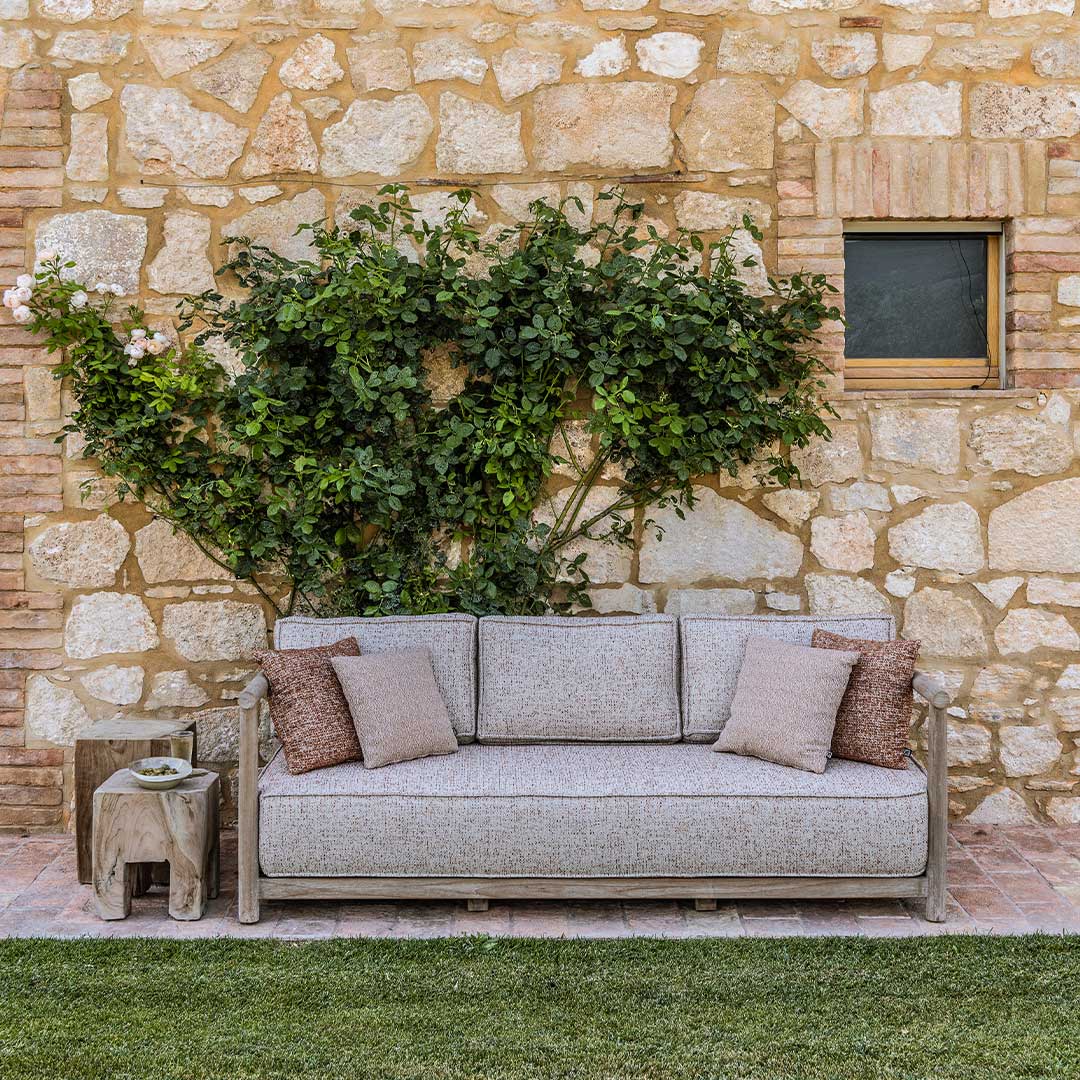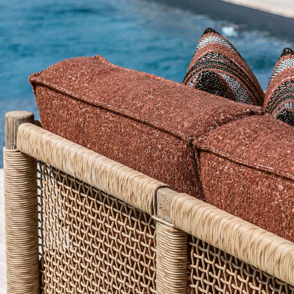 Un elegante sofá para exterior que destaca por su diseño contemporáneo y su uso de materiales naturales.