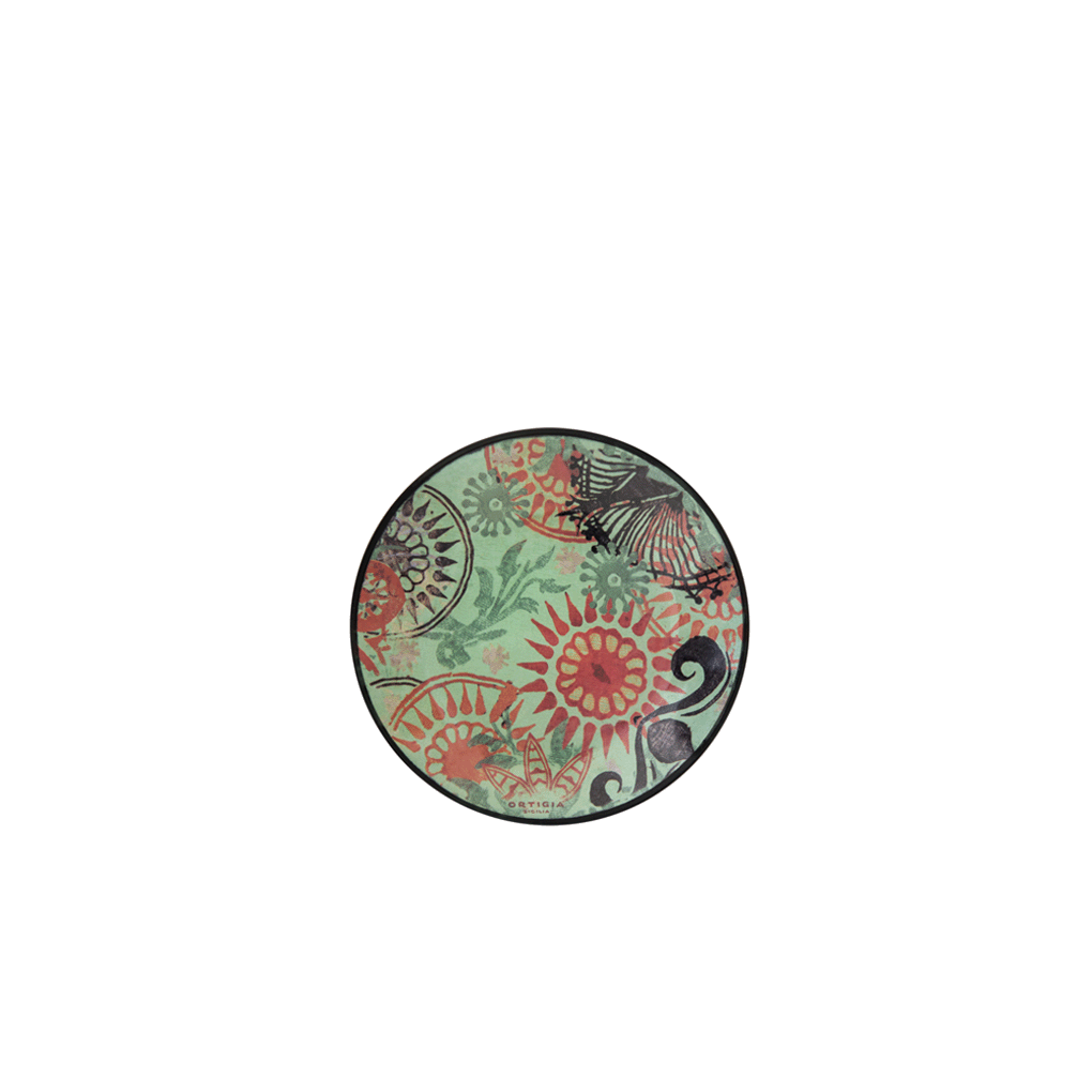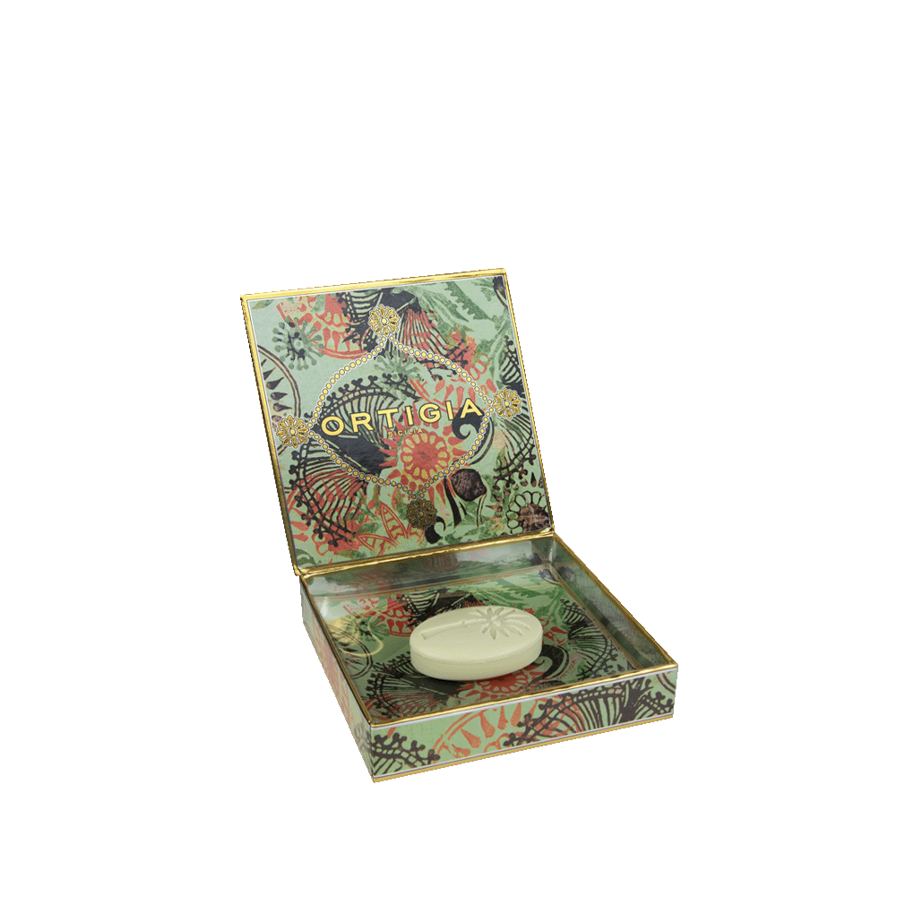 Precioso plato de cristal con serigrafía de Ortigia. El set incluye un jabón de glicerina de 40 gr con una fragancia a flor de cactus, higo y cedro.