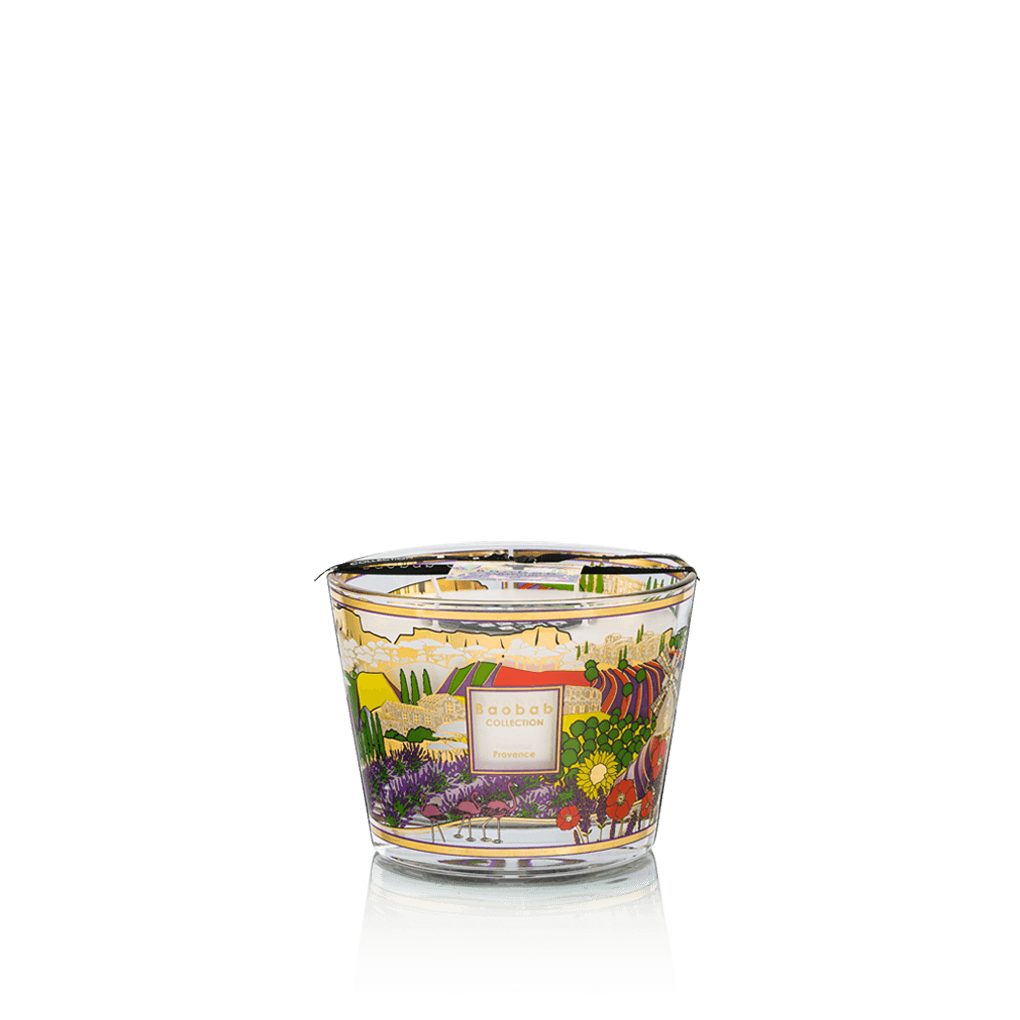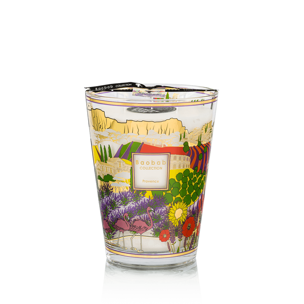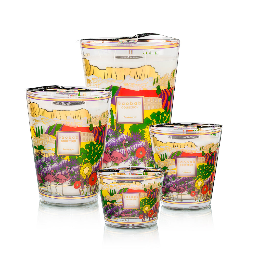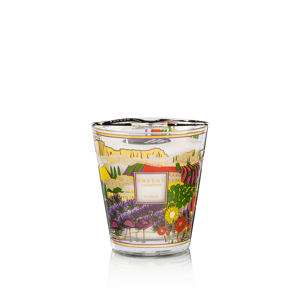 Inspirada en la colorida imaginación de David Hockney, la vela perfumada Provence está decorada con una serigrafía de oro de 24 quilates aplicada a mano, que transforma los paisajes emblemáticos en una cartografía luminosa y alegre. Les Baux-de-Provence, la abadía de Sénanque, las masías rodeadas de cipreses y el elegante castillo de Lourmarin se entrelazan como las páginas de un diario de viaje, mientras que los flamencos rosados aportan un toque lúdico de la Camarga.