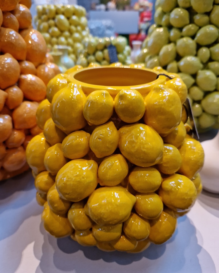 Los icónicos jarrones de limones capturan la esencia vibrante de los cítricos madurados bajo el sol del Mediterráneo. Disponible en 3 tamaños de jarrones y un bowl: