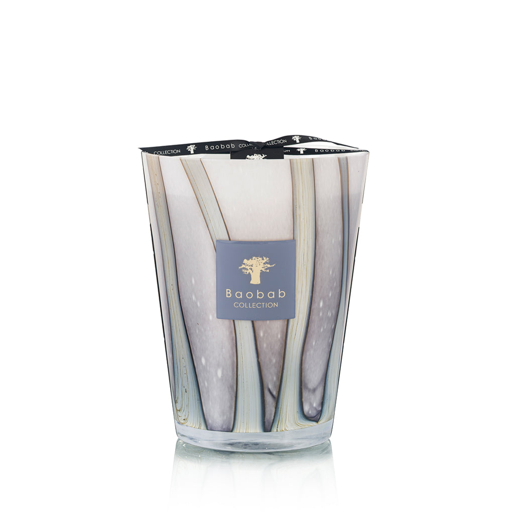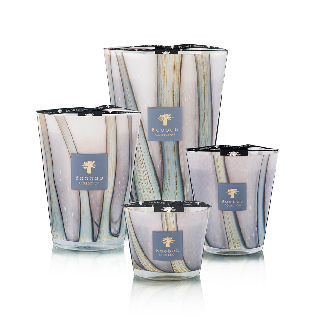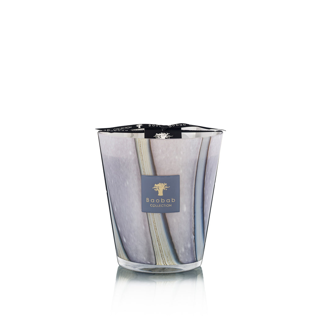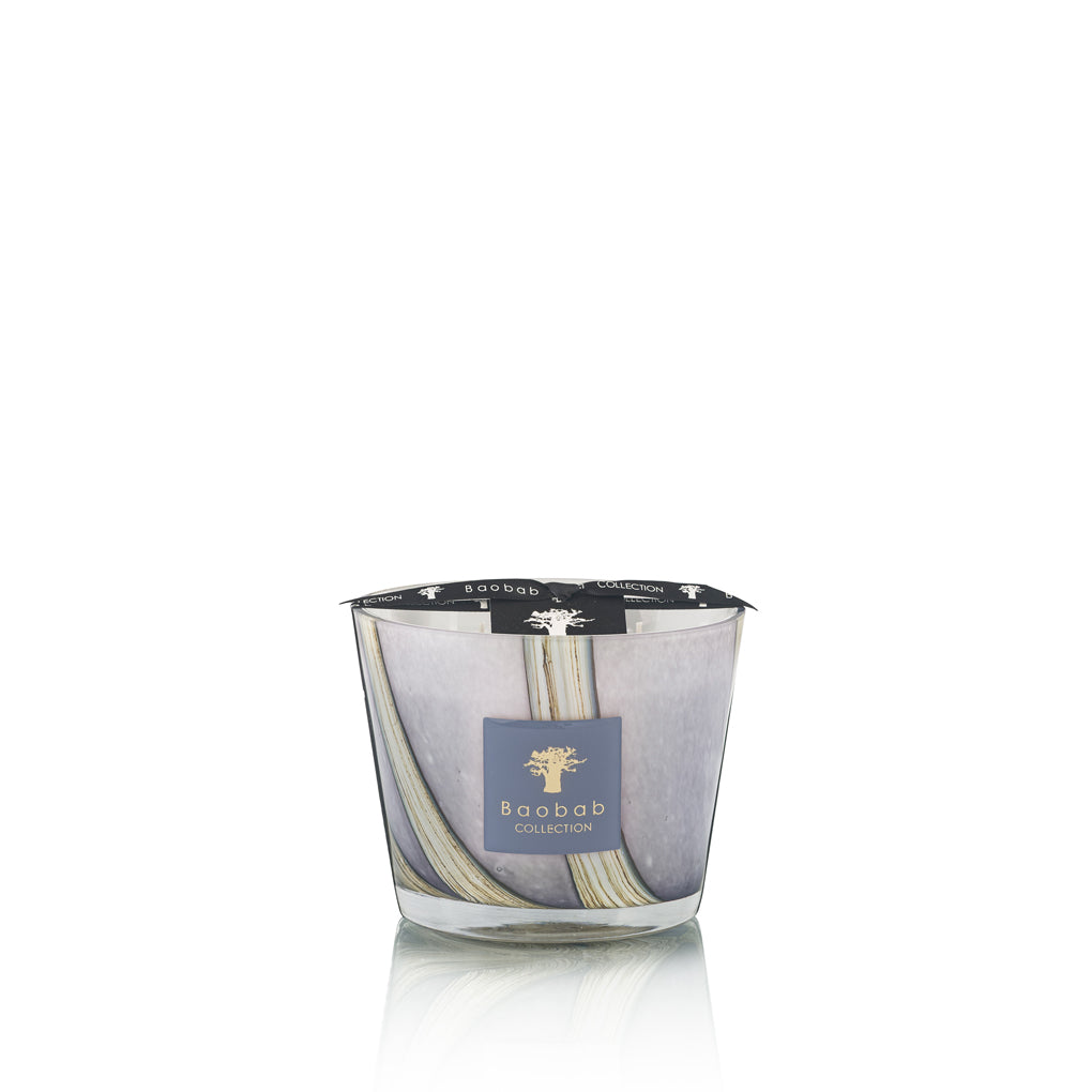 El vidrio de la vela perfumada Brocéliande, con líneas verticales que evocan los árboles que se elevan hacia el cielo, oscila sutilmente entre el gris y el violeta parma para un aspecto extremadamente refinado.