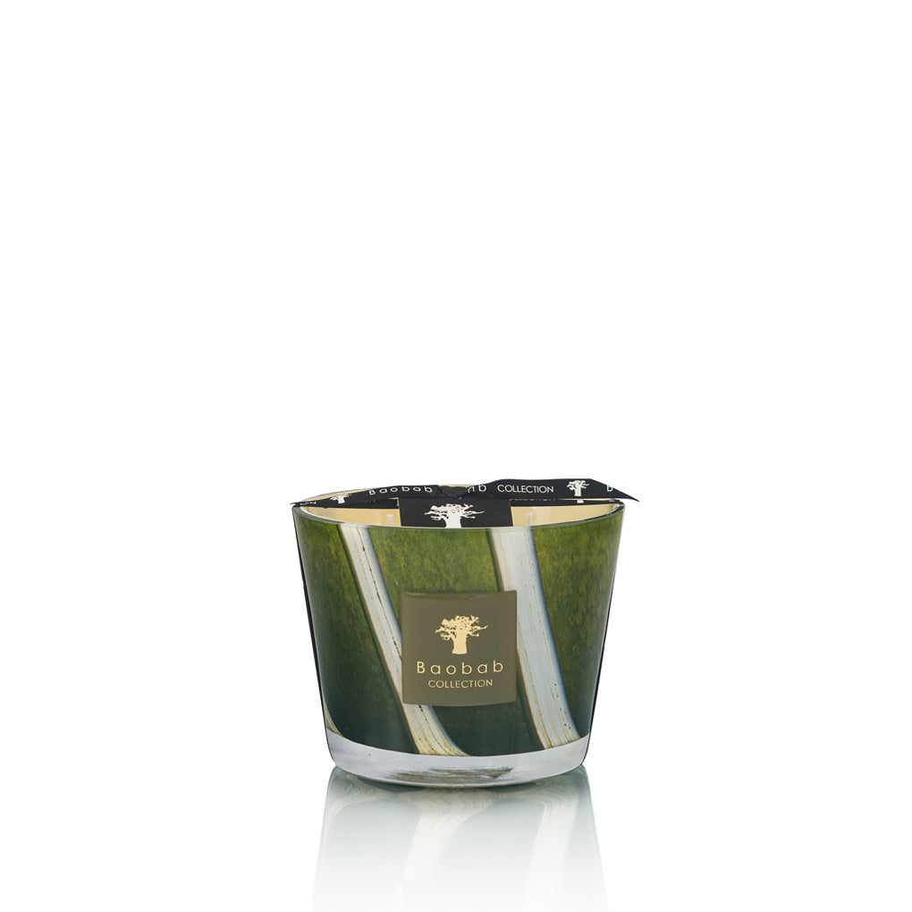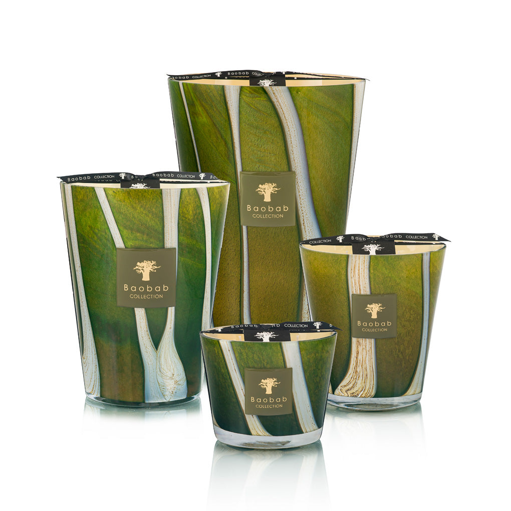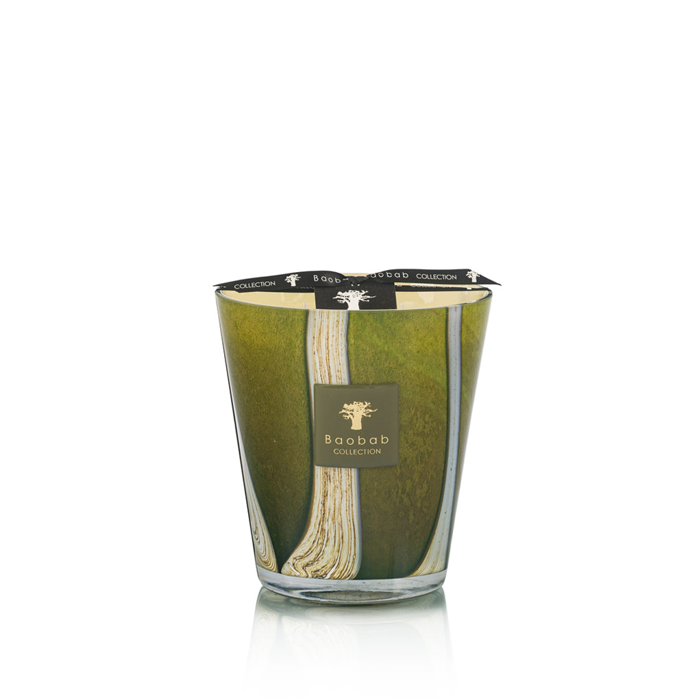 El recipiente de la vela perfumada Sherwood está salpicado de líneas verticales que recuerdan a los majestuosos troncos que se elevan hacia el cielo. La vela, de un verde intenso con reflejos caqui, que oscila entre el marrón y el amarillo, capta la luz y cobra vida con destellos cautivadores.